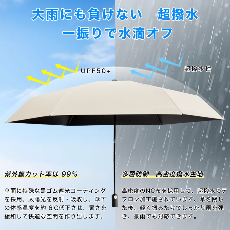 【UV カット&晴雨兼用】高密度 UV カット素材により、紫外線遮蔽率 99% 以上を実現。真夏の強い日差しから肌をしっかり守り、日傘としても完璧に機能します。雨の日はしっかり雨を防ぎ、晴れの日は紫外線対策を行う晴雨兼用傘として、1 本で 2 つの役割を果たします。