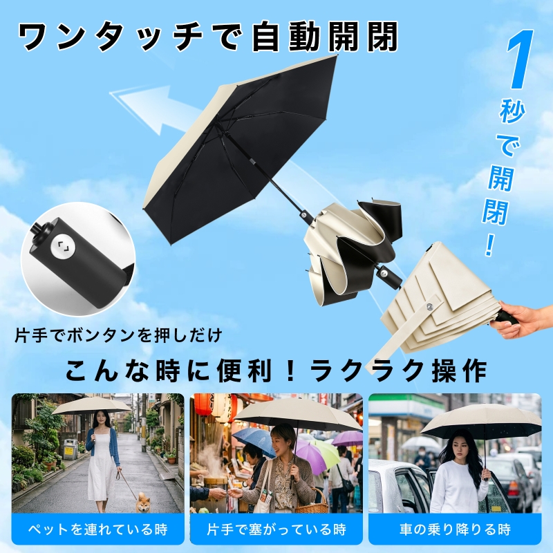 ワンタッチ自動開閉&超軽量230g】片手でサッと使える自動開閉機能を搭載。ボタンひとつで「開く」も「閉じる」も完了するため、荷物が多い時や車の乗り降り、電車の乗降時にもスムーズに扱えます。