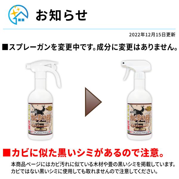 ・カビではないシミに使用してしまう事例が多いためフローリング、床材には使用不可としました。他、結露の多い木材部分でもカビではないシミがあるので注意してください。