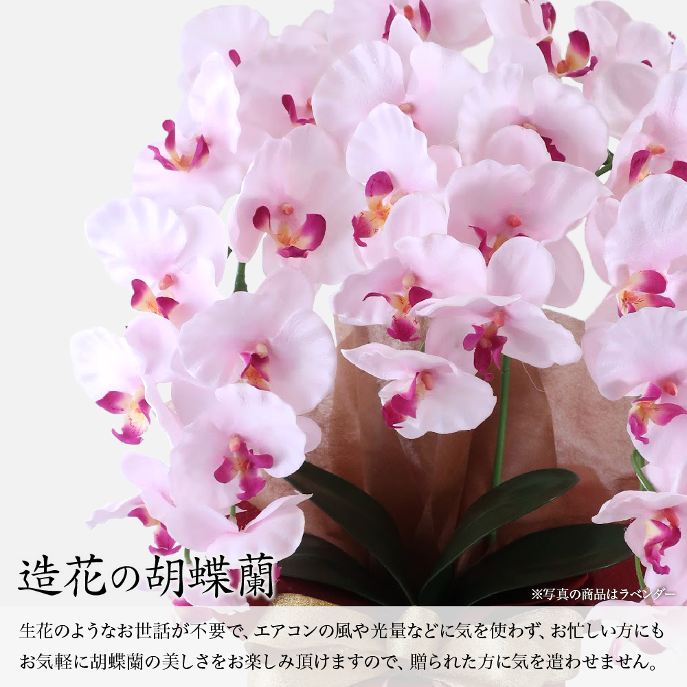 ■特徴:あらゆるお祝い事に喜ばれる枯れない豪華な胡蝶蘭。 水やり不要でお手入れ簡単なので受け取られた方もストレスフリー。空気をきれいにすると言われるCT触媒加工済です。