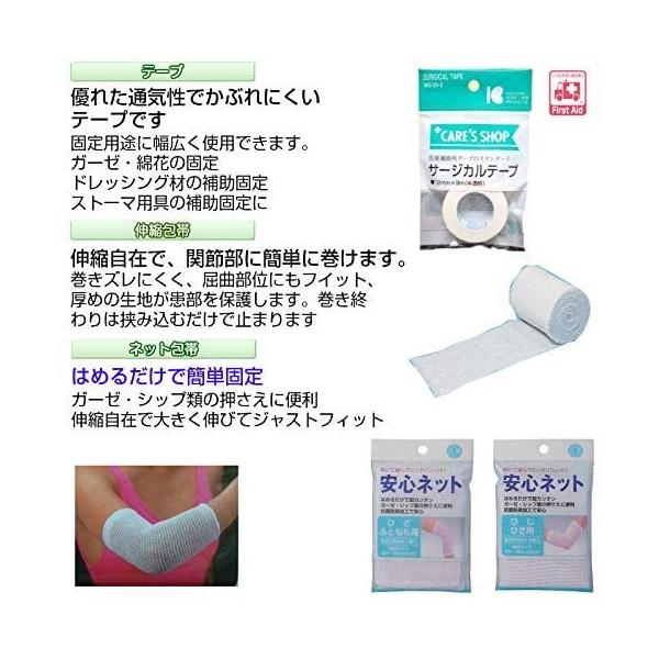 サージカルテープ/防水フィルム/カットガーゼ/カット綿/包帯はさみ/ピンセット/毛抜き/伸縮包帯/ネット包帯A/ネット包帯B/ 三角巾/ケアリーヴ 救急絆創膏M10枚/ケアリーヴ救急絆創膏ジャンボ5枚/眼帯/綿棒プラ缶入200本/大人用マスク/子供用マスク/医薬部外品消毒液/使い捨て手袋