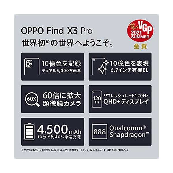「商品情報」【好きなものを、10億色で撮る、見る、愛する】 OPPO Find X3 Pro は10bitフルパスカラーシステムを搭載。 一般的な8bit(約1,677万色)に比べ、10bit(約10億色)は豊かな色階調と実物に近い色彩再現を可能にします。 【曲線美だけでつくった、未来デザイン】 カメラモジュールと背面パネルがなだらかに一体化した曲線美は緻密な設計と技術力によって実現しました。 近未来的な美学を体現しながら、手で包み込みたくなるフォルムです。 【消費電力を抑える機能も充実】 圧倒的な色数と約6.7インチの大きな画面で最上級の視覚体験を。解像度はQHD+。 自動で8192段階の輝度調整に対応。 最大120Hzのリフレッシュレートに対応しており、コンテンツに応じて自動調整・節電します。 バッテリーを抑えつつ、スムーズな操作性です。 【10分で約40%充電可能。過充電による電池の劣化を防ぐ。】 バッテリー劣化を防止する、OPPO独自の急速充電技術「65W SuperVOOCフラッシュチャージ」とQiにも対応。 【最高等級IP68の防水防塵に「主な仕様」
