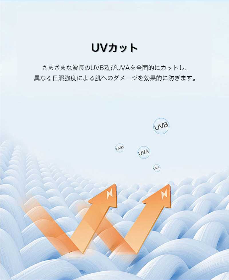 さまざまな波長のUVB及びUVAを全面的にカットし、異なる日照強度による肌へのダメージを効果的に防ぎます。