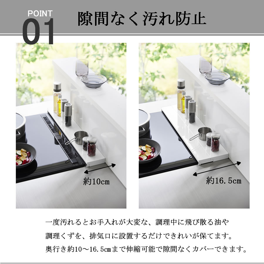 壁から排気口まで隙間なく汚れガード : 奥行 フラット 伸縮 タワー 排気口カバー 油はね 鍋置き