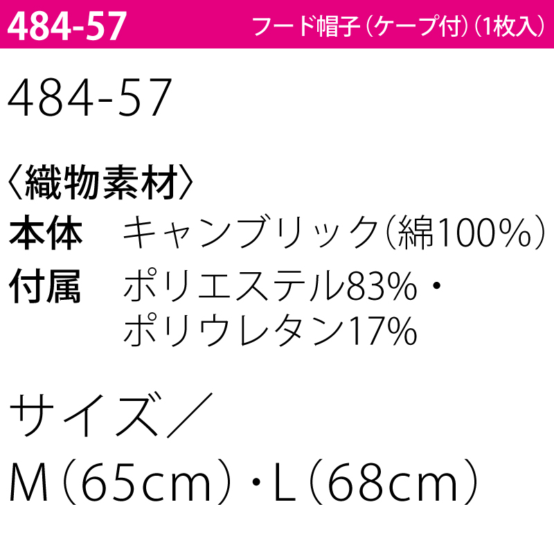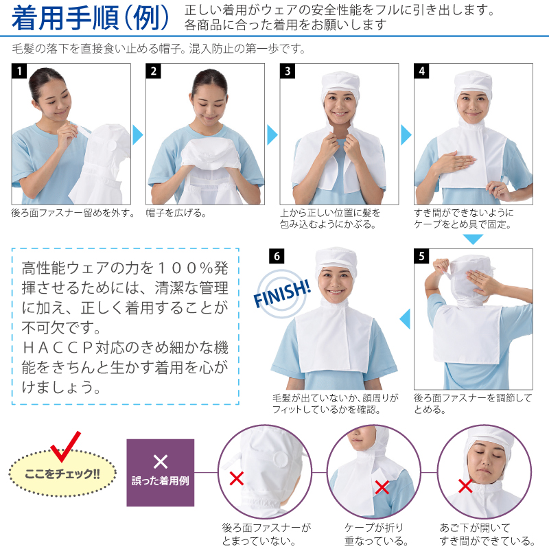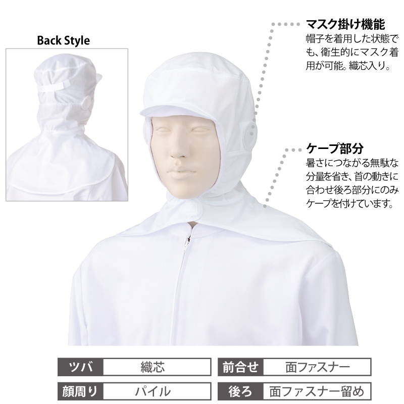 ●仕様:ツバ・織芯、前合せ・面ファスナー、顔周り・パイル、後ろ・面ファスナー留め、マスク掛け機能、ケープ、HACCP、ハサップ