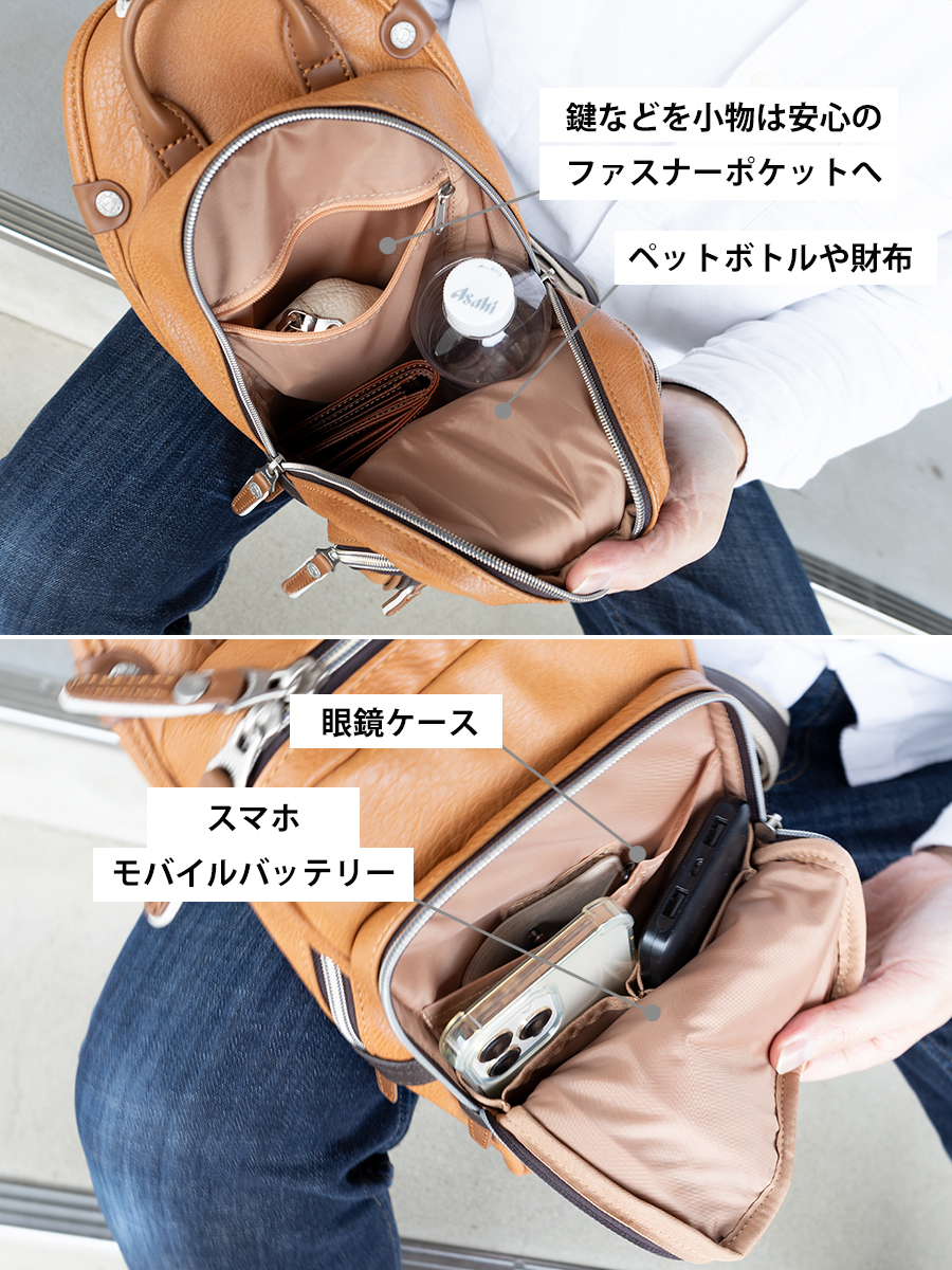 大きめの前面ポケット内にポケットが配置されておりスマホやメガネなどさっと取り出したいアイテムを収納できます。メイン層にはペットボトルなども収納でき、見た目以上の収納力です。