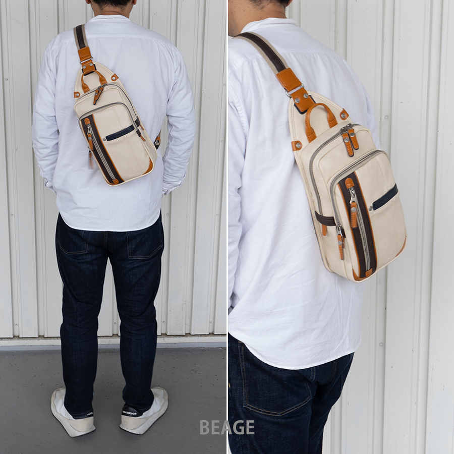 革を思わせる表情のある合皮の高見えするボディバッグです。ポイントに他色を組み合わせ地味すぎず装いをおしゃれに見せてくれます。