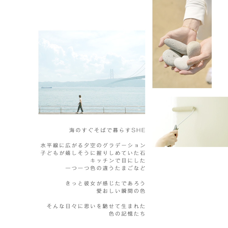 淡い色彩は見る人・映す物によって様々な色合いに感じられ、光の具合や昼夜の見え方など、時間帯によっても大きく変わります。