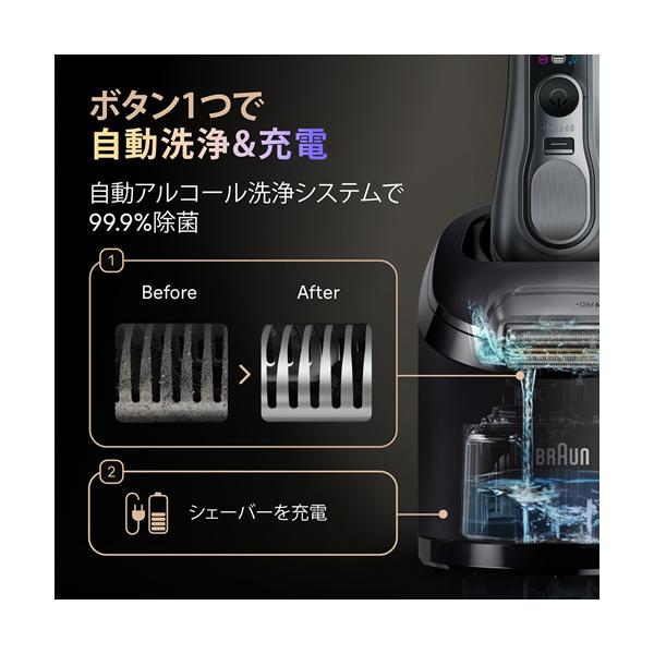 5in1自動アルコール洗浄システムで99.9%除菌。毎日新品のような剃り味へ。