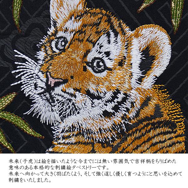 多色細密刺繍で描かれた未来(子虎)は、7色もの糸で刺繍を施し針数も多くリアルで幼いながらも虎らしさを表情豊かに表現いたしました。背景にはすくすくとまっすぐに育つよう、そして生命力・健康・成長の象徴とされている竹も刺繍で表現しています。