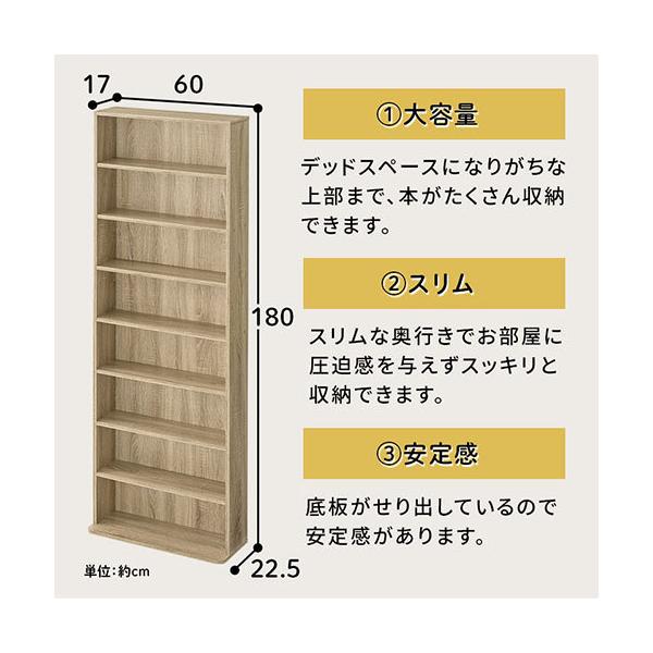 本棚 スリム カラーボックス おしゃれ 大容量 木製 薄型 収納棚 コミックラック 漫画収納 棚 書棚 cd dvd 8段 側板奥行17cm 高さ180cm 幅60cm