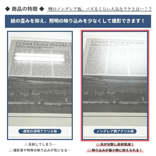 割れにくい材質として無反射ガラスの代用、撮影時によれたり歪みをおさえる、反射や映り込みを抑える