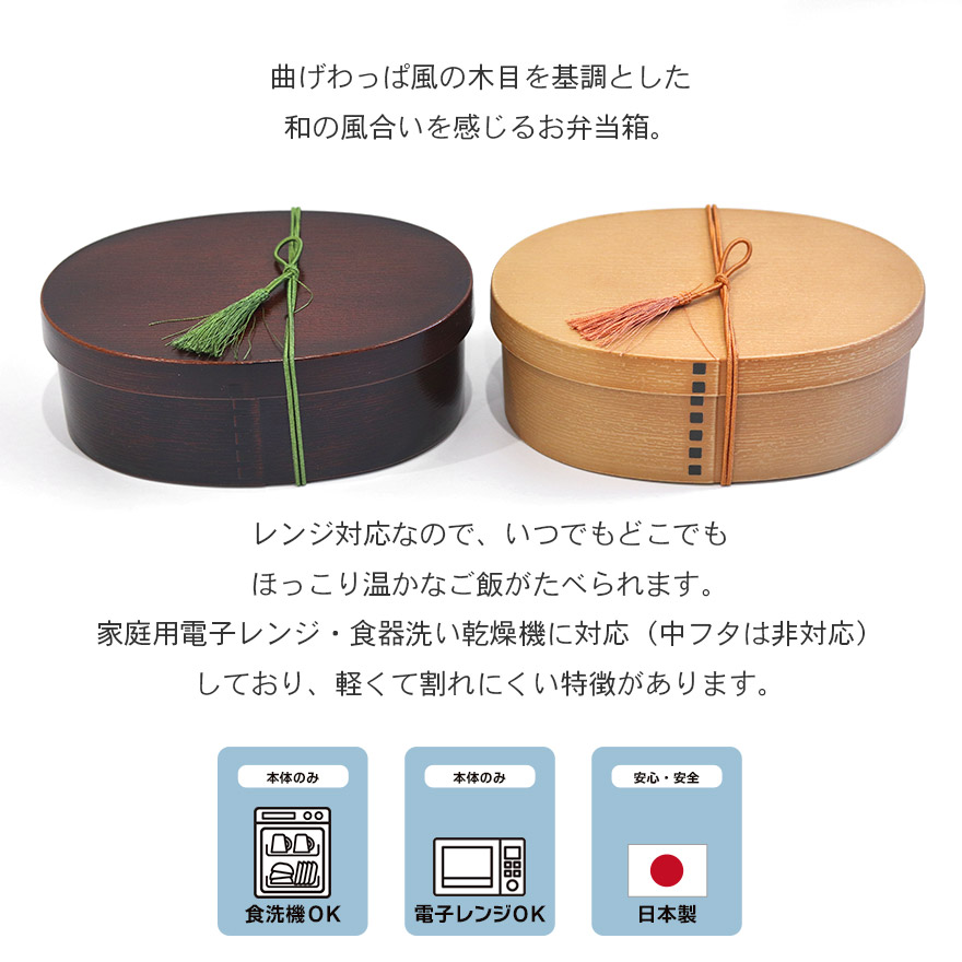 お弁当箱 日本製 曲げわっぱ弁当箱 食洗機対応 レンジ対応 小判 小 一段 550cc バンド 仕切り付き 白木 茶 抗菌加工 曲げわっぱ風 木目調 母の日