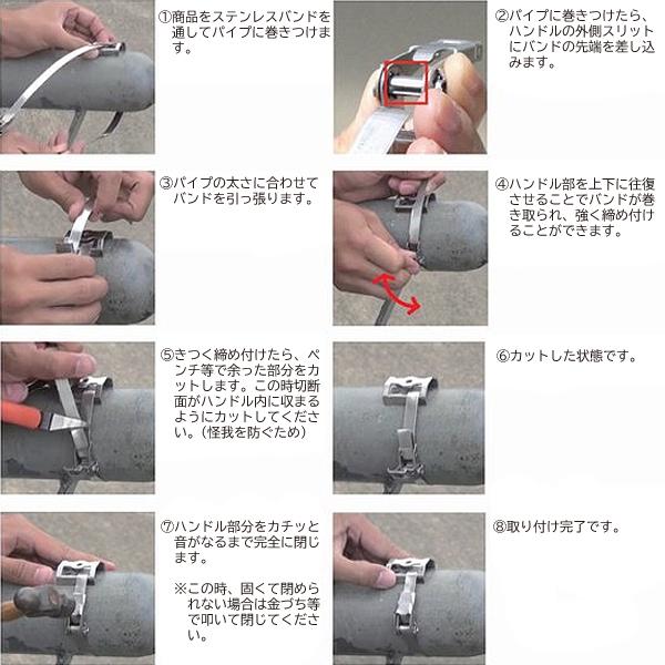 ラチェット方式で強力な締付け力が得られます。手でレバーを反復させるだけで十分に締め付けができ、作業性に優れています。(写真はステンレスバンド160のものです)