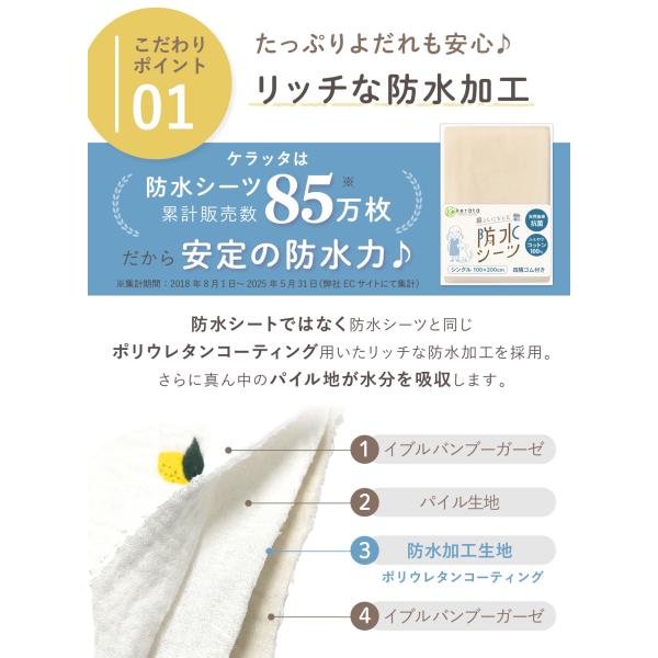 【防水加工でよだれをキャッチ!】防水シーツNo1のケラッタだからできる独自の防水加工を採用。ポリウレタンコーティングの防水加工を施した生地が入っているのでたっぷりよだれもキャッチ。抱っこ紐・お洋服を汚しません。