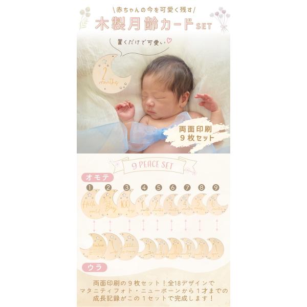 マンスリーカード 両面9枚セット 木製 月齢カード 1歳まで使える ニューボーンフォト セット インスタ映え 寝相アート 赤ちゃん お祝い プレゼント 命名書