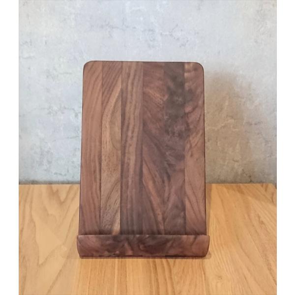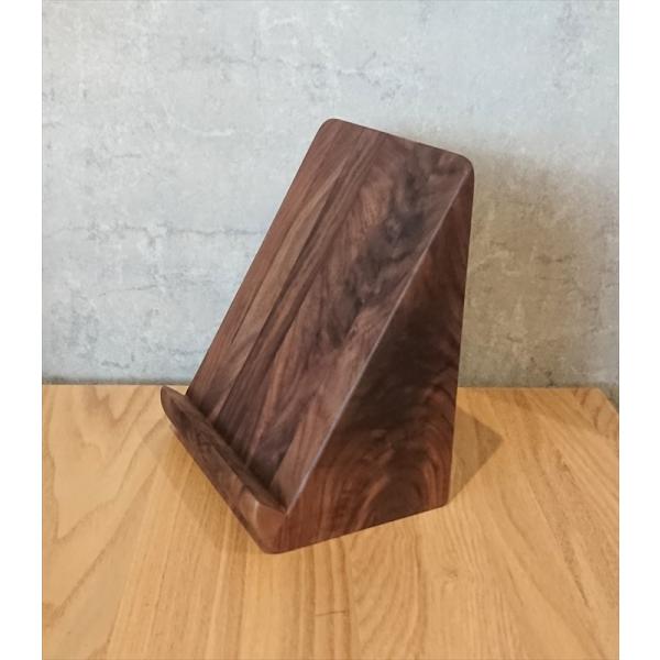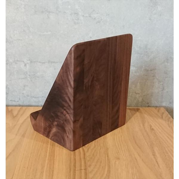 天然木の風合いを楽しめるウォールナット無垢材だけで作ったタブレット立てです。iPadなどのタブレット端末だけでなく、スマホやiPhoneも立てられます。