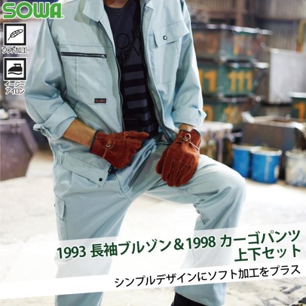 桑和 SOWA 作業服 上下セット 1993 長袖ブルゾンM-3L と 1998 カーゴパンツ 73-100 秋冬用 作業着 おしゃれ かっこいい 作業ズボン