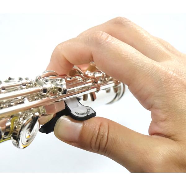 Fキイの近くに取り付け、右手親指の位置や角度を正しくすることにより、楽器が手前に回転してしまうことを防ぎます。右手の指に入る力を減らす効果もあり指の動きが自由になるので、アンブシュアや楽器が安定し、演奏がしやすくなります。ロイヤルコンセルトヘボウ管弦楽団首席奏者 エミリー・バイノン氏も絶賛のグッズです!
