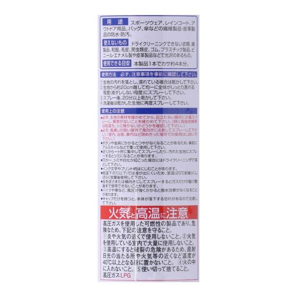 ◇◇ 【特長】 ●お得な2本パック。水・油を強力に撥水、撥油。通気性、風合いを損なわない。 ●皮革製品にも使用できる。 【用途】 ●スポーツウェア、レインコート、アウトドア用品、バッグ、傘などの繊維製品、皮革製品の防水・防汚 【使えないもの】 ●ドライクリーニングできない衣類、絹製品、和服、毛皮、爬虫類皮、ゴム、プラスチック製品、ビニール・エナメル製や皮革製品などで光沢のあるもの。 【仕様】 ●サイズ(約):高さ210mmX幅130mmX奥行き65mm ●重量(約):770g ●使用できる目安:本製品1本でカサ約4本分。 ●成分:フッ素樹脂。石油系炭化水素、LPG 【注意事項】 火気のあるところでのご使用はお止めください。ご使用の際は、製品に書かれている注意書きを必ずご確認の上、よく換気して使用してください。