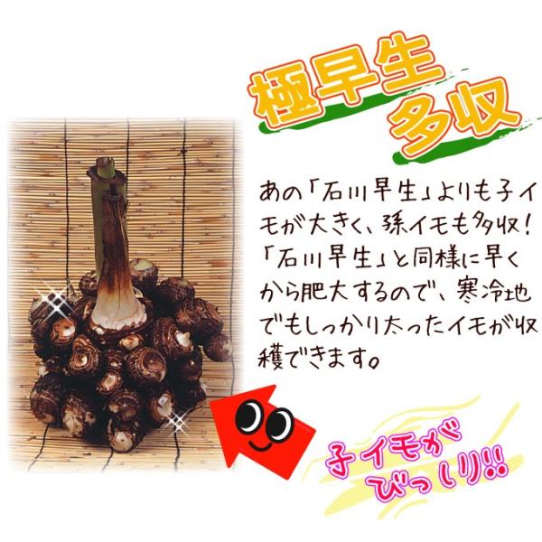 ●商品情報:あの「石川早生」よりも子イモが大きく、孫イモも多収!「石川早生」と同様に早くから肥大するので、寒冷地でもしっかり太った里芋が収穫できます。