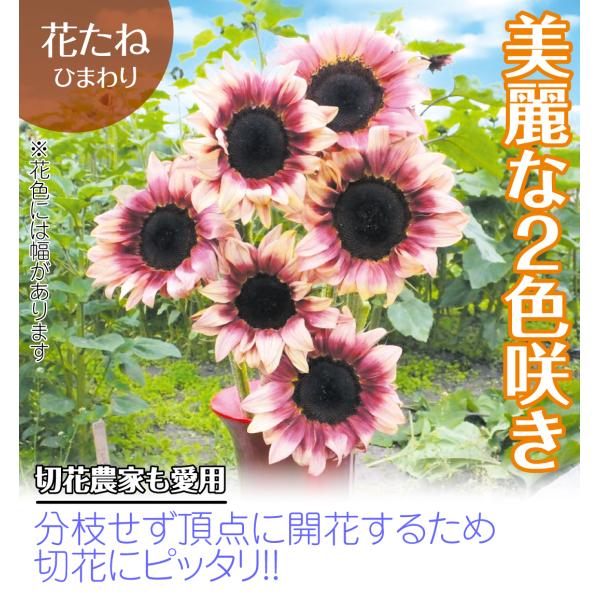 ●商品情報:昨年度ひまわり人気No.1に輝いた期待の新星!プラム色の花弁の先がクリーム色になる2色咲の美麗花です。茎が丈夫で長く、枝分かれもあまりしないので、切花に重宝される「プロカットシリーズ」は切花農家も愛用している優秀品種ばかりです。