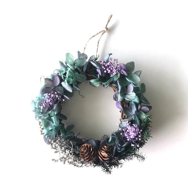 ・リース・あじさい・かすみ草・ウォッシュラベンダー・ミニツガ・ソフトヒムロスギ