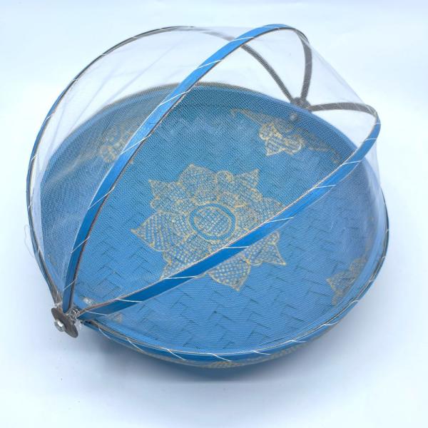 フードストッカー 竹製 かや付き 丸型 M W30cm スカイブルー ホワイト おしゃれ バンブー 虫よけ付き 網付 収納バスケット くだものカゴ