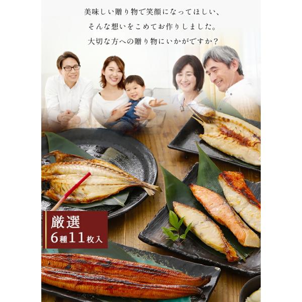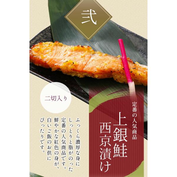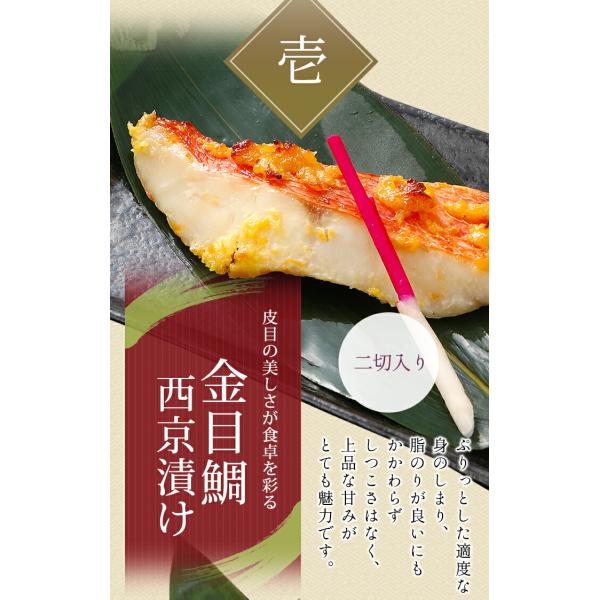内容量:金目鯛西京漬け 2切、上銀鮭西京漬け 2切、本さわら西京漬け 2切、真あじの開き 2枚、真かますの開き 2枚、うなぎ長焼き 1枚