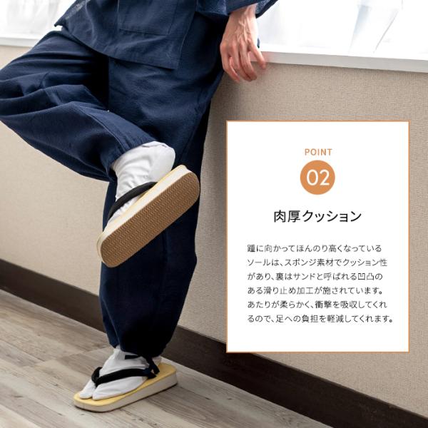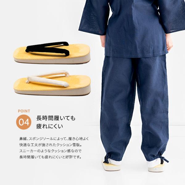 幅広い用途や場面で大活躍の定番の雪駄です。 底はスポンジでクッション性があり、裏は凹凸のある滑り止め加工付き。 牛革底に比べ長時間履いても足への負担が少ないです。 普段履きやお祭り、イベントなどにおすすめです。