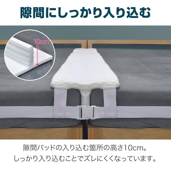2つのマットレスの隙間を埋めるパッドです。幅が30cmあることで隙間への沈み込みを抑え、ズレにくくするため高さを10cmに設定しました。2つのマットレスをしっかり固定できるバンドが付属しています。