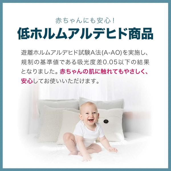 遊離ホルムアルデヒド試験A法(A-AO)を実施し、規制の基準値である吸光度差0.05以下の結果となりました。赤ちゃんの肌に触れてもやさしく、安心してお使いいただけます。