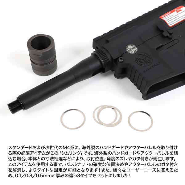 スタンダードおよび次世代のM4系に、海外製のハンドガードやアウターバレルを取り付ける際の必須アイテムがこの「シムリング」です。海外製のハンドガードやアウターバレルを組込む場合、本体との寸法相違などにより、取付位置、角度のズレやガタ付きが発生します。このアイテムを使用する事で、バレルナットの確実な位置決めやアウターバレルのガタ付きを解消し、よりタイトな固定が可能となります!また、様々なユーザーニーズに答えるため、0.1/0.3/0.5mmと厚みの違う3タイプをセットにしました!