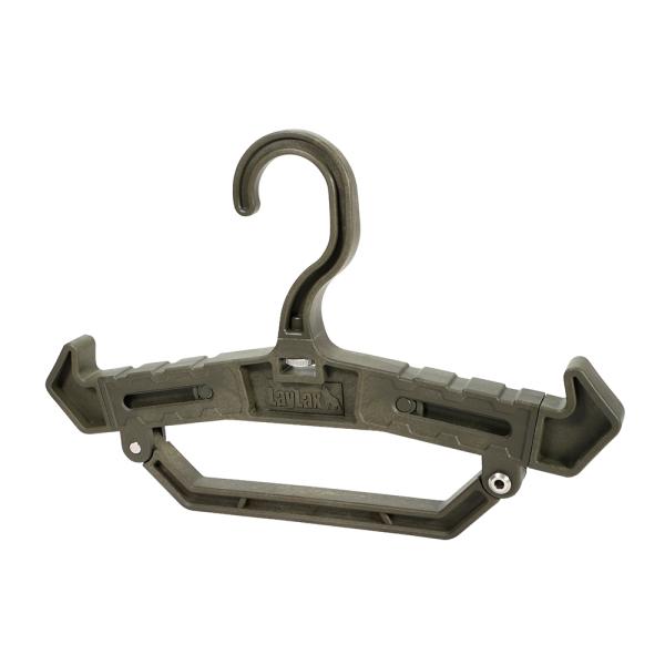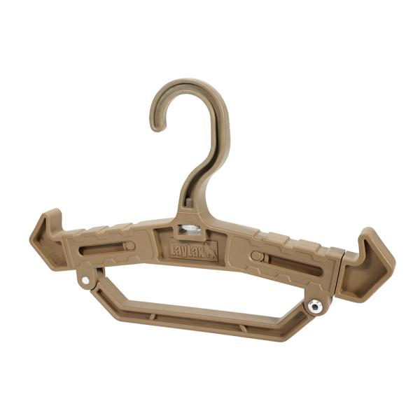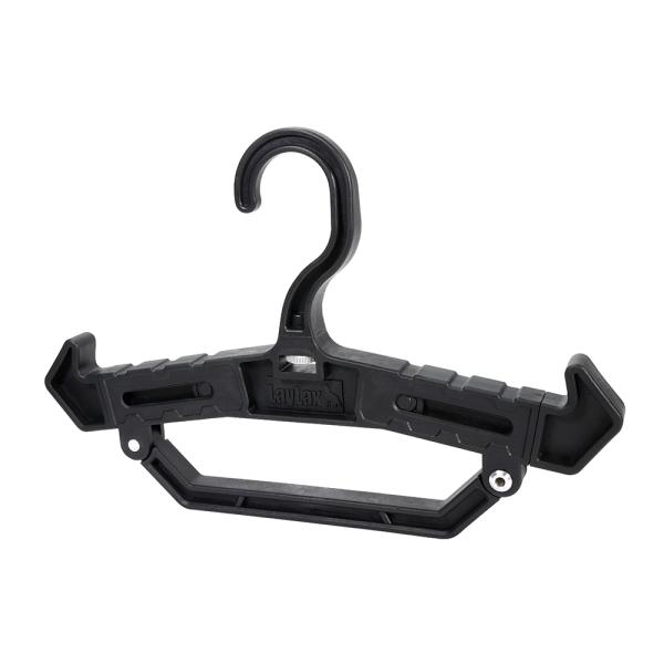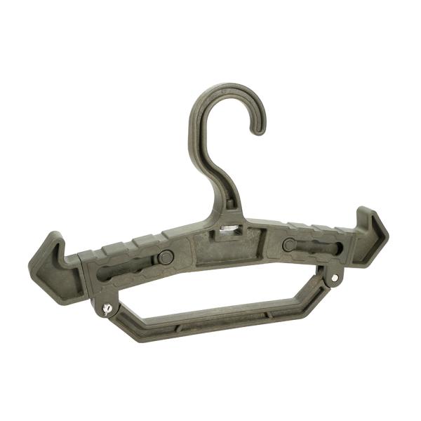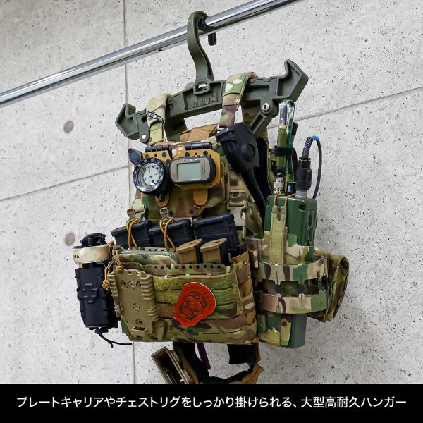 プレートキャリアやチェストリグを掛けるのに最適な高耐久ハンガー!肩部の伸縮や向きの変更をすることで、吊るす物や用途に合わせた使い方が可能です。フックの向きを90°回転することができ、メタルラックなどにかけることもできます。下部のハンドル部はピンを片方外すことで開閉できます。最大50mmまでのハンガーパイプに対応!
