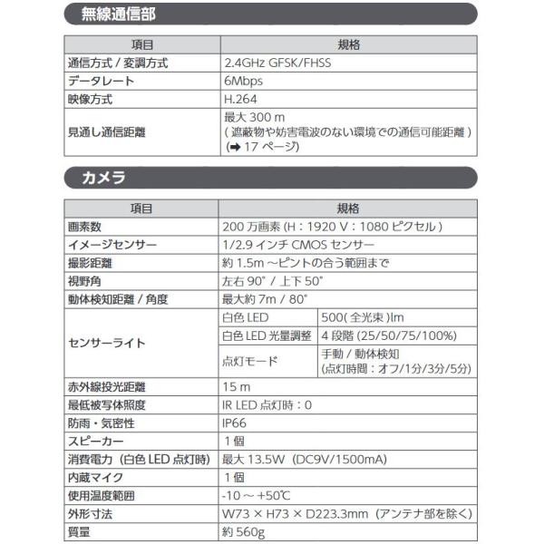 ・カメラ:幅73mm×高さ73mm×奥行223.3mm(アンテナ部を除く)、質量560g