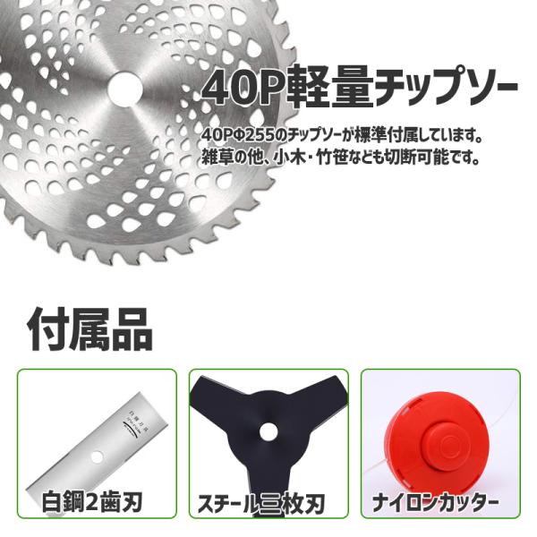 ・付属品も充実(草刈機用刃×1枚・ナイロンカッター刃・レンチ・ドライバー・六角レンチ・燃料ガソリンメモリ付き容器)