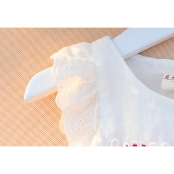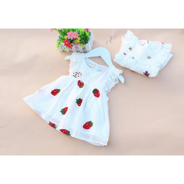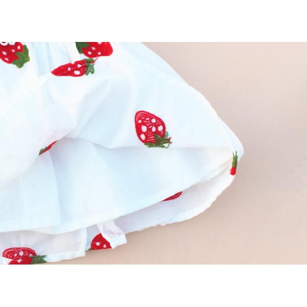 【詳細】いちごやお花の刺繍が特徴な可愛いらしいワンピースです。生地は軽くて柔らかく、100%コットンなので、真夏に着せたい1着となります。