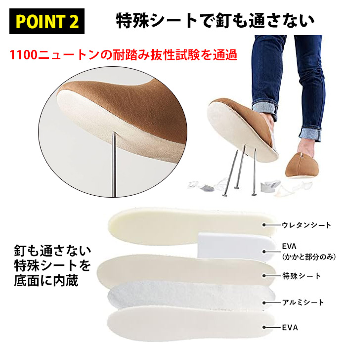 しかし、いざという時には特殊素材を採用した丈夫な設計で、釘やガラスなどの危険な異物から足を守ります。