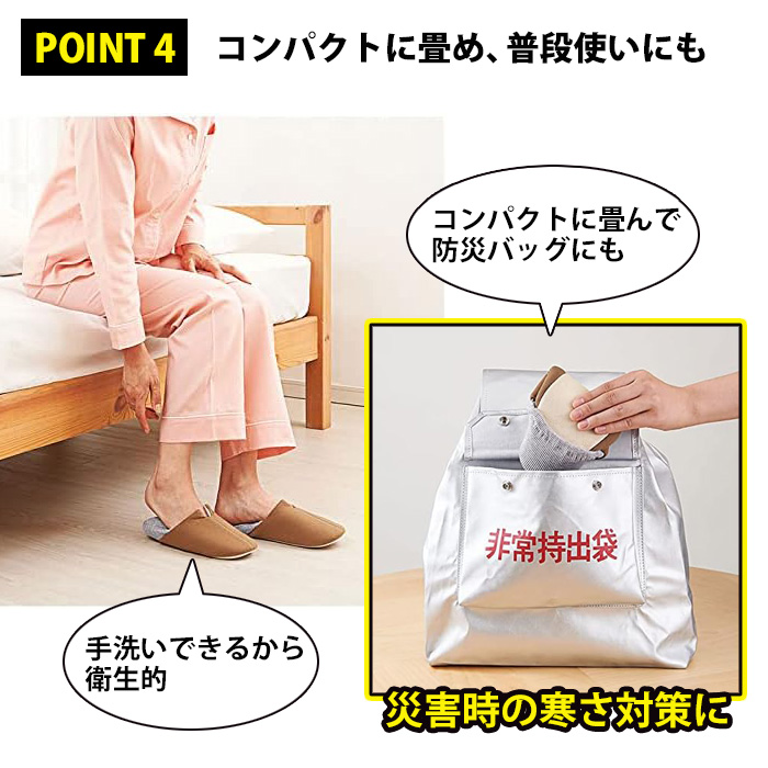 見た目も普通のスリッパと変わらないからこそ、災害への備えがしやすく、玄関や寝室などいつでも手の届くところに置いておくことが可能です。