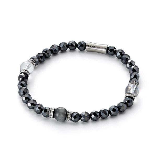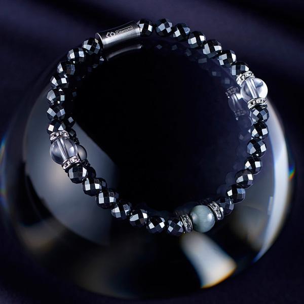 シンプルでありながら高スペックな腕用磁気アクセサリーです。天然石を組み合わせたデザインは、パワーストーンとも呼ばれ、それぞれに意味があり運気がアップするといわれています。磁石粒には48面体のミラーカットが施され、高級感と上品さを兼ね備えています。また、紐にはゴムが採用されており、着脱が容易です。円柱状のロゴ入りステンレスパーツにはヘアライン加工が施され、ロンデルパーツがアクセントとなって腕まわりに品のある印象を与えます。100ミリテスラの磁石粒が48面体のミラーカットで腕回りに配置され、血行を改善しコリを緩和します。コラントッテ独自のN極S極交互配列により、磁力を広範囲に影響させ、装着部位の血行を改善し、コリを緩和する効果を発揮します。