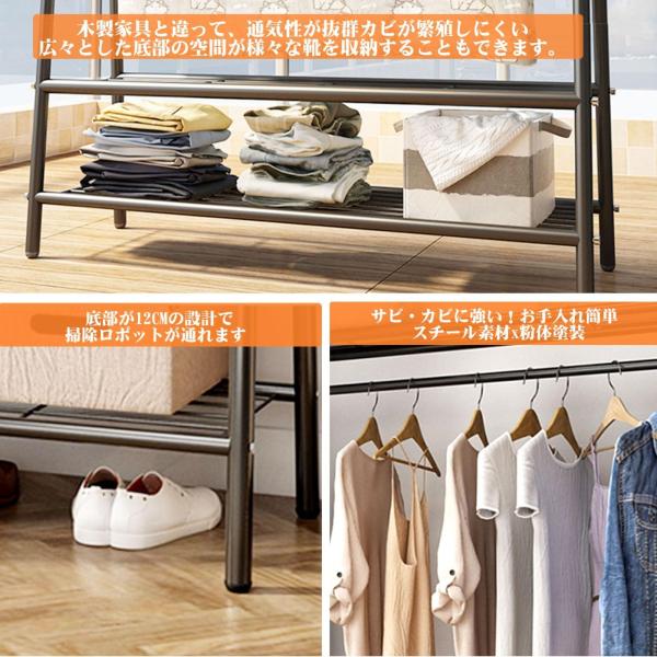 この洋服ラックは最新のパイプハンガーシリーズで、上中下の異なる3段メッシュ棚が薄い布団や収納ボックスから靴、タオルや小物までご自由にたくさん置いて使っています。また高さ94.5CMの掛ける空間が横幅82CMの太いパイプボールを採用し、子供の制服、夏シャツや洋服などをスッキリ収納できます。それにメッシュ棚の底部が12CMの設計でルンバなど掃除ロボットも通れて、気楽に服の収納以外に、日常の部屋クリーンケアも便利です。