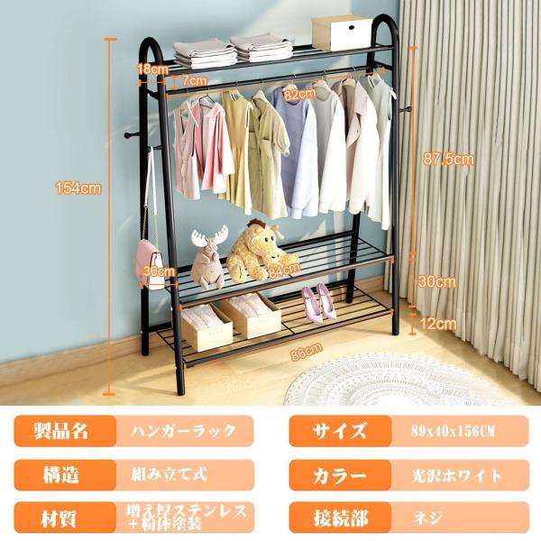 ハンガーラックの本体の表面は水・錆・腐食に比較的強いエポキシ塗装がされていて、湿気の多い場所でもご安心にお使い頂け、耐久性がほどほどにあります。全体的にメッシュ棚な構造で木製家具と違って、通気性・可視性がよく、カビが繁殖しにくいです。普通の市場版よりサポートパイプが19MM増え厚ステンレスで作れ、安定性が優れます。