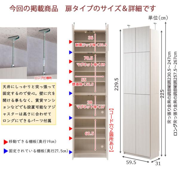 ■商品サイズ/本体:(約)幅59.5×奥行31×高さ229.5(立上がり扉高さ4.5cm含む)cm、突っ張り高さ調節範囲:(通常アジャスター時)(約)230.5〜247cm(ロングアジャスター時)(約)257.5~267cm