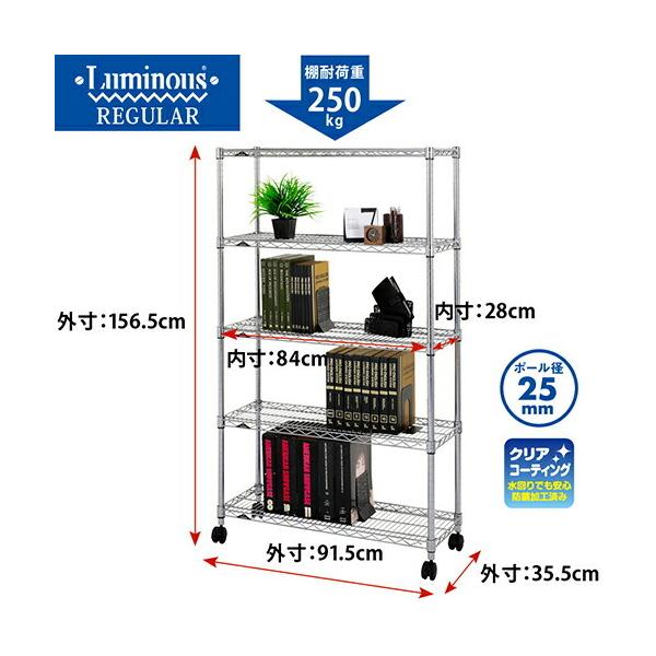 スチールラック 幅90cm 5段 ルミナスレギュラー スチール棚 業務用 中量棚 収納棚 納戸 大容量 棚耐荷重250kg 幅900 幅91.5×奥行35.5×高さ156.5cm NLF9015-5