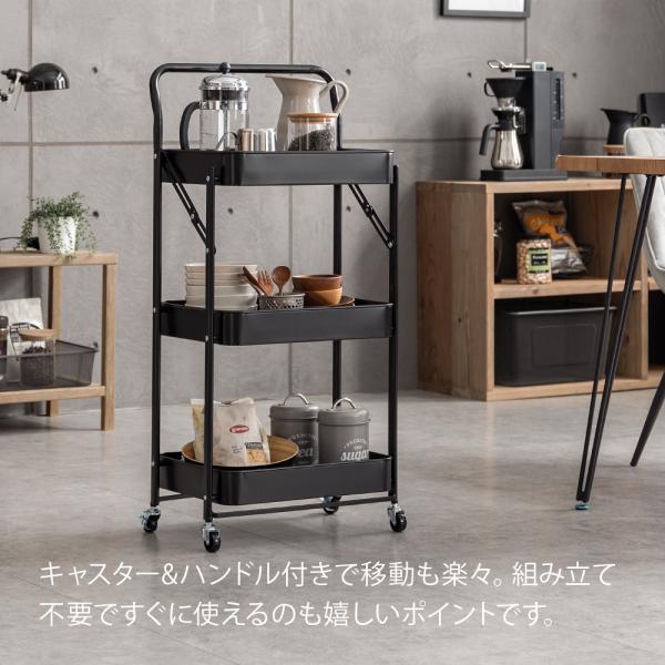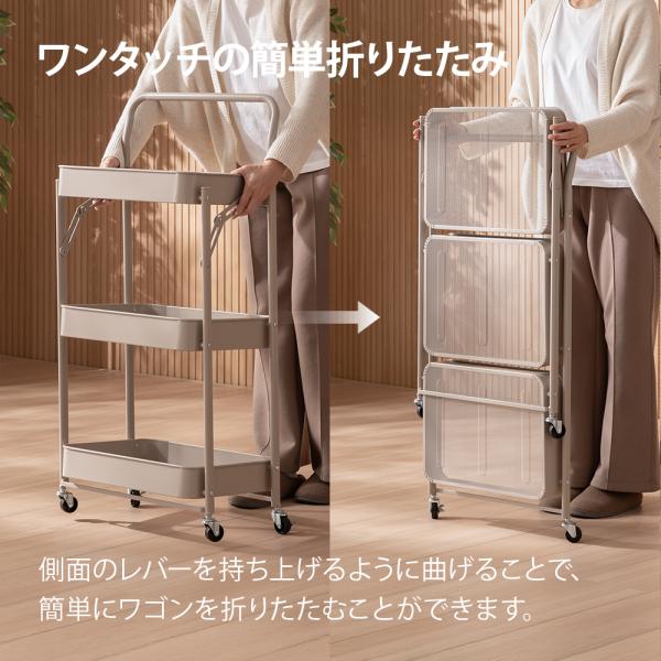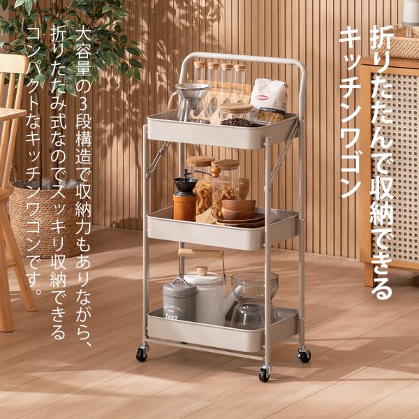 折りたたみ キッチンワゴン 3段 キャスター付き キッチンラック 折りたたみキッチンワゴン キャスターワゴン スチールワゴン スリム コンパクト 軽量