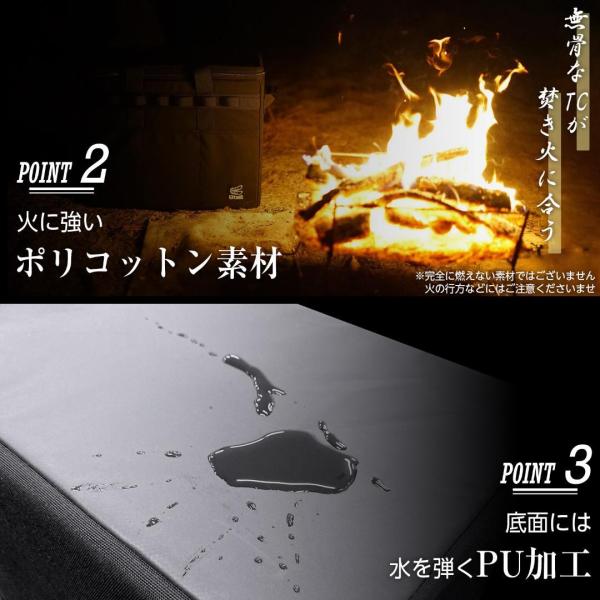 ポリコットン素材を採用。焚き火のそばでも安心な素材です。※燃えない製品ではございませんので、火の行方などにはご注意ください。