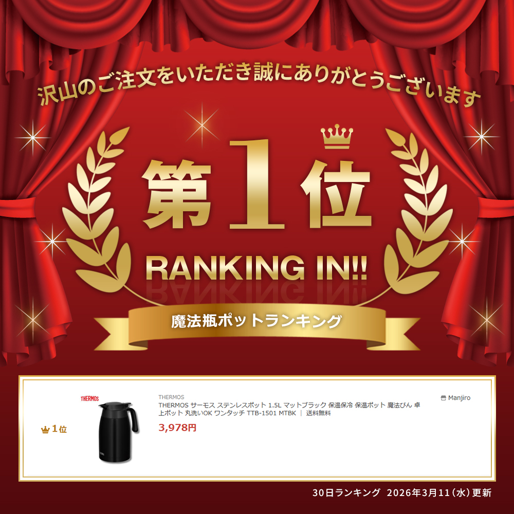 THERMOS サーモス ステンレスポット 1.5L マットブラック 保温保冷 保温ポット 魔法びん 卓上ポット 丸洗いOK ワンタッチ TTB-1501 MTBK | 送料無料