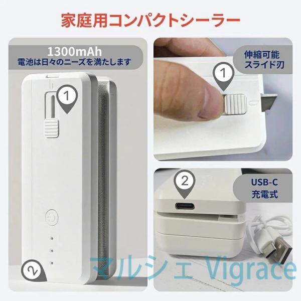 ヒートシーラー シーラー 食品シール機 12.1cm 熱圧着パウチ 小型 充電式 ハンドヘルド 3段階調節可能 マグネット開閉デザイン 予熱不要 カット&密封