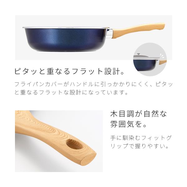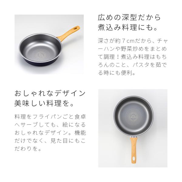 3.5mmの底厚で熱が均一に伝わりやすいIH対応フライパン。26cmの深型タイプなので、シチューなどの煮込み料理にもオススメ。パスタも折らずに茹でられるサイズです。焦げ付きにくいからお手入れ楽々。手になじむ木目調のフィットグリップ。内面2層、外面2層の多層コート!内面は人工ダイヤモンド配合のふっ素樹脂コートで耐磨耗性が高く、外面はセラミックコートで汚れが落としやすい!