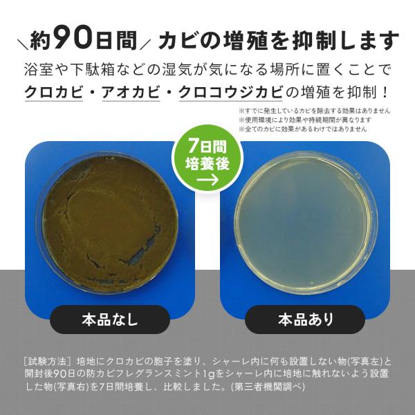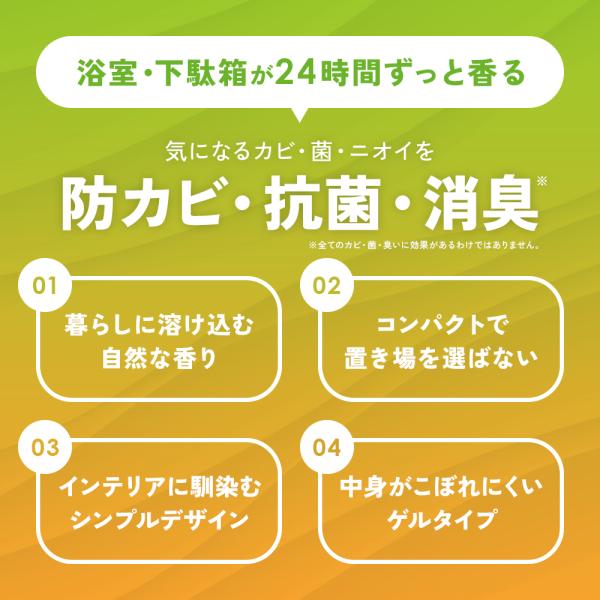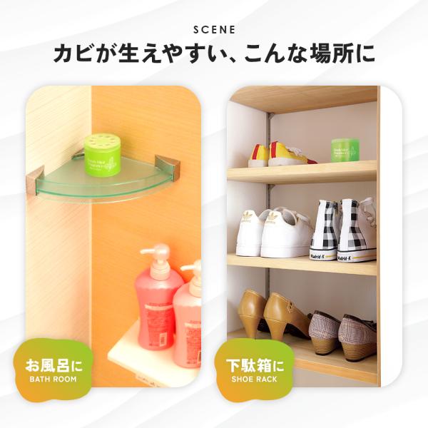 天然由来の香りでカビの発生を防ぐ。気になる場所に置いて、約90日間カビが増えるのを防ぎます。(※効果は使用状況により異なります。)お風呂や押入れ、クローゼット、下駄箱などのカビが生えやすい場所に。